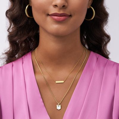 Fossil Women s Stainless Steel Gold Tone Harlow Linear Texture Bar Necklace Color Gold Model JF04533710 One Size Stainless Steel Cubic Zirconia Amazon Clothing Shoes Accessories Very well made.