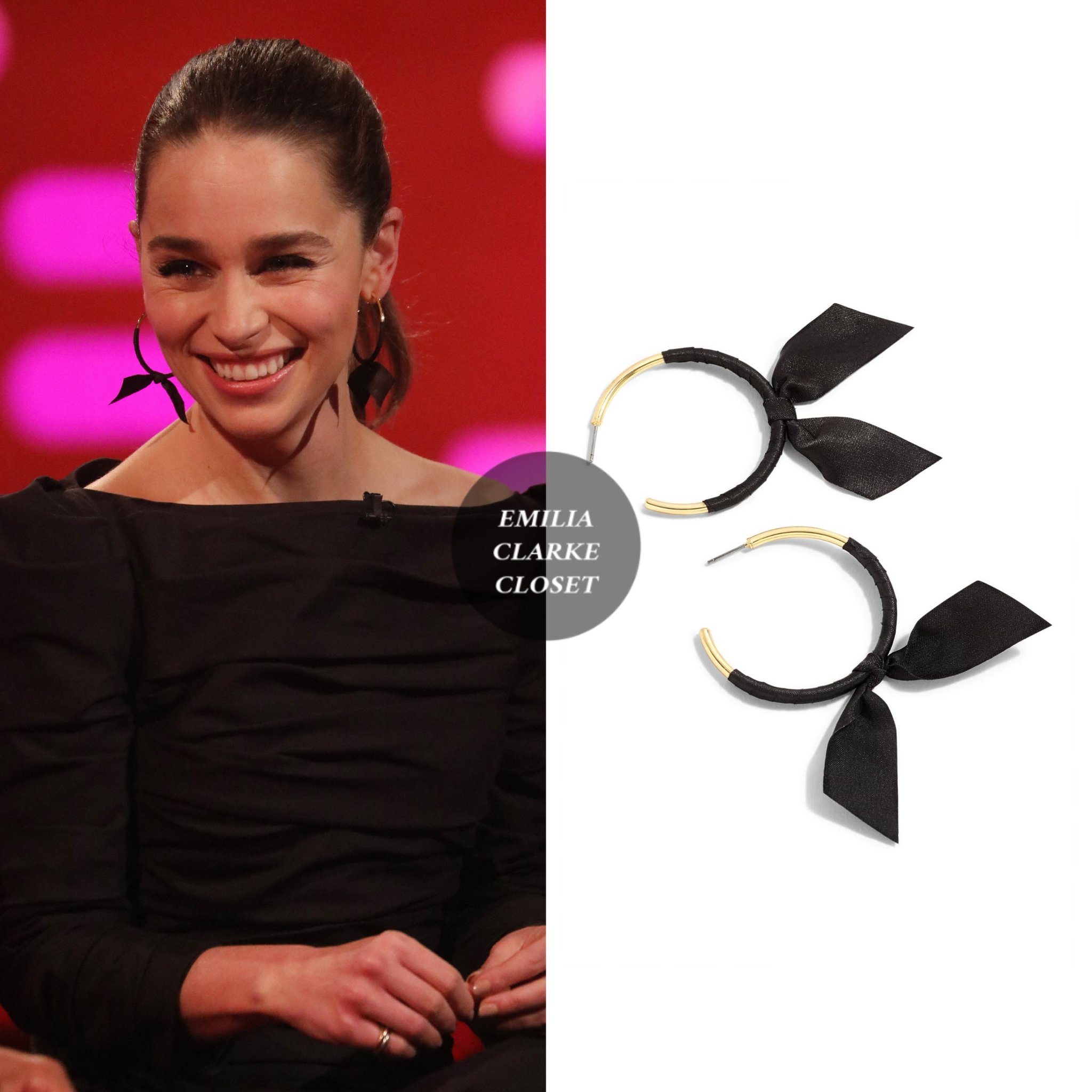 on X Emilia Clarke make an appearance on GrahamNortonFan in London UK Oct 25 2019 She s wearing jcrew Ribbon wrapped Hoop Earrings 22 and AlexMonroeJewellery Signet Ring with Teeny Weeny Very well made.