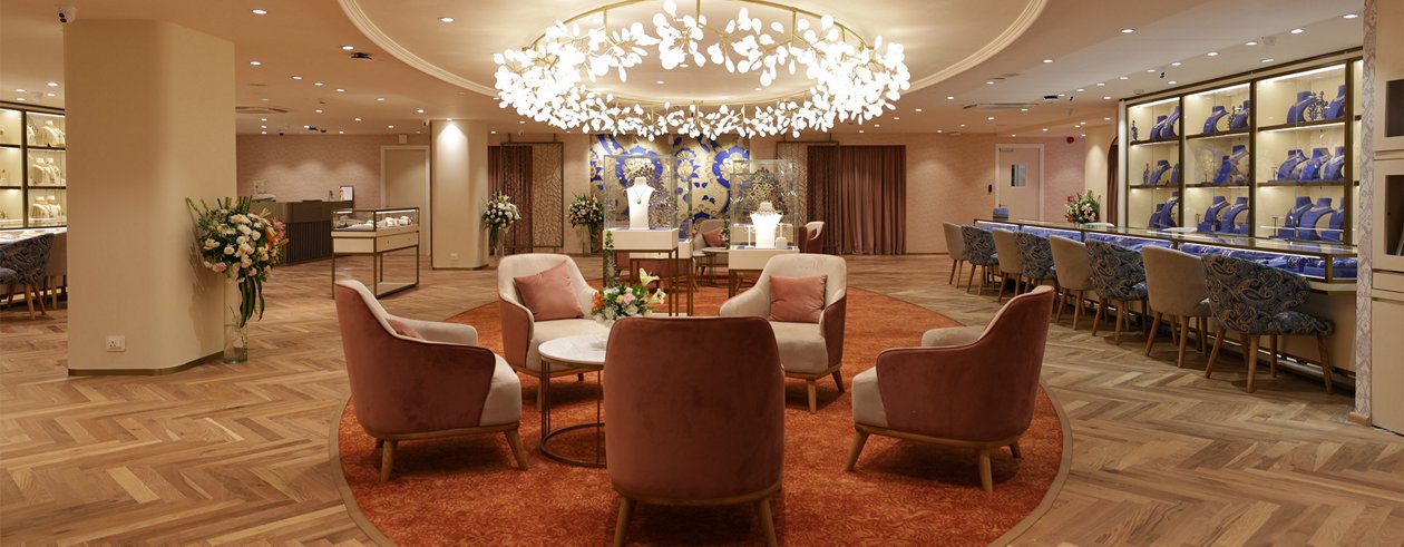 Soft hued jewellery store designed for owner with love of gold and pink Very well made.