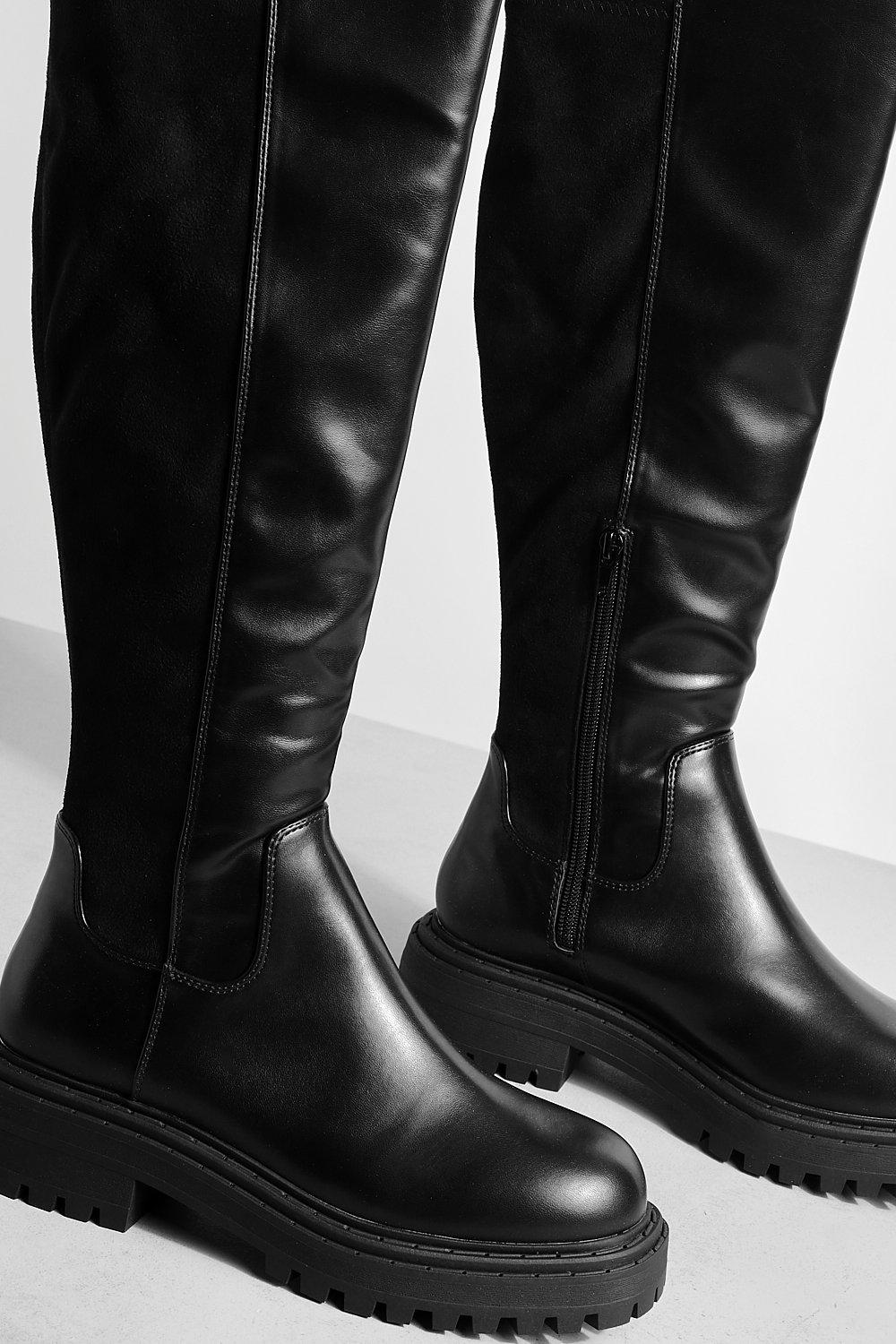 Boohoo Women s Croc Flat Faux Suede Knee High Boots Black Very well made.